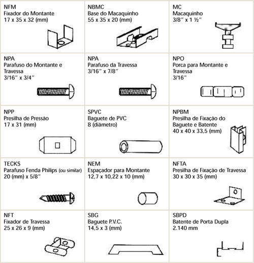 As peças de fixação ou acessórios são produzidos em aço e podem ser perfiladas, dobradas ou estampadas, conforme a utilização e a necessidade de resistência mecânica. No vidro, usa-se um baguete de PVC para acabamento.